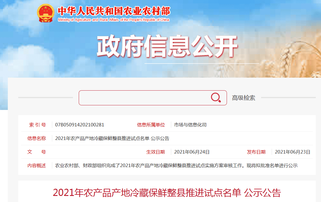 按照《农业农村部办公厅 财政部办公厅关于全面推进农产品产地冷藏保鲜设施建设的通知》(农办市〔2021〕7号)要求,农业农村部、财政部组织完成了2021年农产品产地冷藏保鲜整县推进试点实施方案审核工作。现将拟批准名单进行公示,公示期为6月24—30日。如有异议,请实名向农业农村部市场与信息化司反映。反映情况要实事求是,并提供有关证明材料。