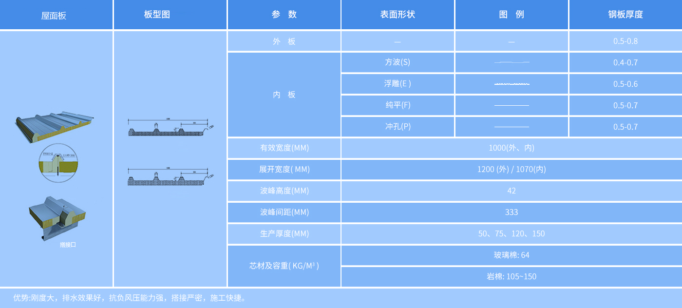 采用独有的防火PIR聚氨酯侧封技术,提高了搭接处的气密性、水密性,有效防止冷桥现象的发生。同时,克服了板材在搬运、安装过程中搭接处钢板与芯材剥离现象的发生。